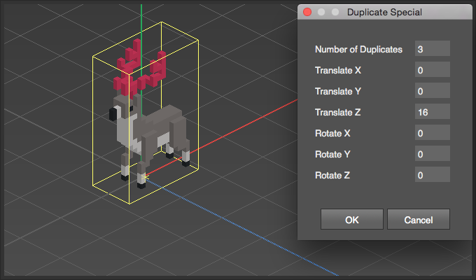 Number of Duplicates | Sets the total amount of copies after the operation. A value of three will produce two duplicates, for a total of three of the same object. |