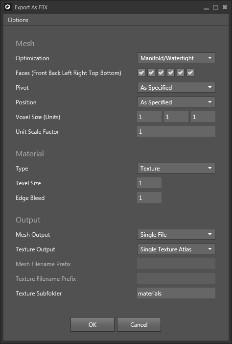 Faces | Remove unchecked voxel faces from the export. Useful when parts of your model, e.g. the bottom are not visible by the user. |