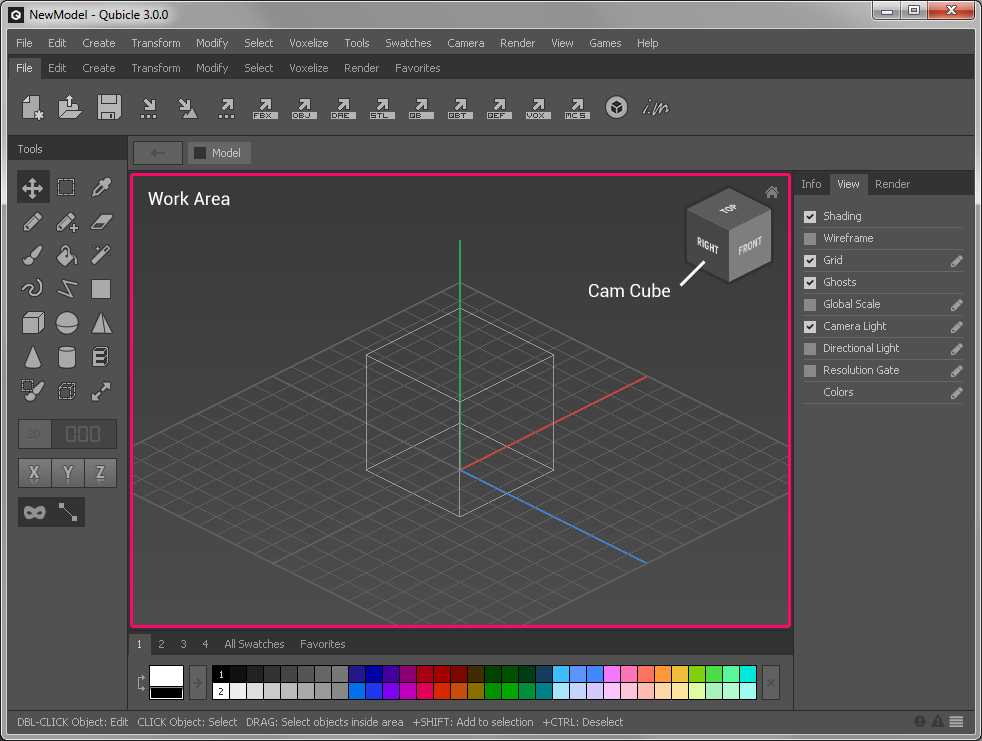 The Work Area is the main window of the user interface and the place where you edit your model.